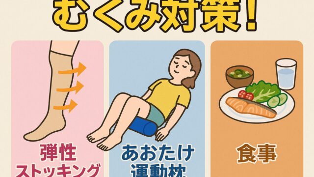 足のむくみはリンパの滞りが原因。弾性ストッキング、あおたけ運動枕を使ったセルフケア、食事改善で根本からケア!ダイエット中の女性にもおすすめの美脚・巡り改善メソッドを紹介します。